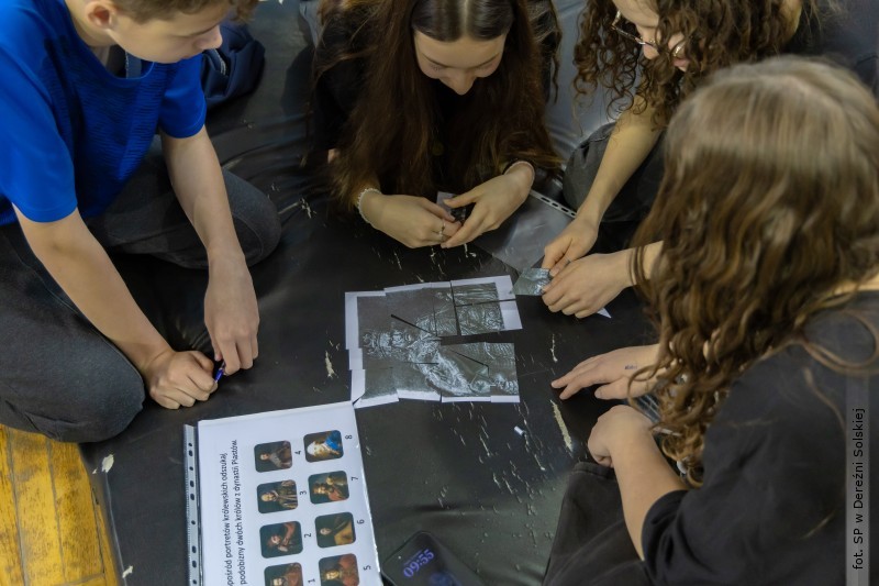 Następnie uczniowie mogli wykazać się swoją wiedzą - klasy IV - VIII pracowały w wylosowanych drużynach. Nazwa każdej z drużyn odpowiadała wybranemu królowi Polski - np. Mieszkowi II, Bolesławowi Chrobremu czy Władysławowi Łokietkowi. Zadania, z którymi przyszło im się zmierzyć to: puzzle, wykreślanka, labirynt oraz krzyżówka. Dodatkowo, uczniowie musieli również: rozpoznać wśród portretów, te przedstawiające królów z dynastii Piastów, odczytać zdania ze średniowiecznego muru, a także ułożyć rozsypankę obrazkową dot. znajomości polskich legend. Na koniec, każda z grup miała za zadanie stworzyć komiks związany ze zjazdem gnieźnieńskim. W tym samym czasie, gdy starsi uczniowie mierzyli się z wymienionymi zadaniami, najmłodsze dzieci miały za zadanie ułożyć puzzle, rozwiązać zadanie matematyczne, którego wynikiem był rok koronacji Bolesława Chrobrego, a na koniec zrobić z papieru imitację korony, którą dekorowali, wycinali i sklejali.