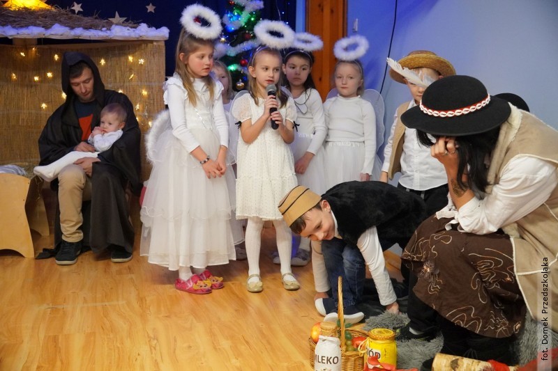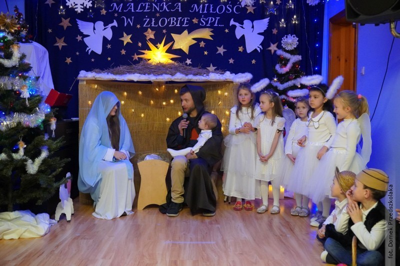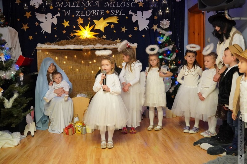 Święta Rodzina przyszła do przedszkolnej stajenki z dzieciątkiem. Aniołowie, pasterze i królowie tańczyli, śpiewali, recytowali. Przepiękna scenografia nadała temu wyjątkowemu spotkaniu uroczysty i nastrojowy klimat świąt Bożego Narodzenia. Na koniec uroczystości zebrani, podzielili się opłatkiem i złożyli sobie świąteczne życzenia. Następnie zasiedli wspólnie do wigilijnego poczęstunku.