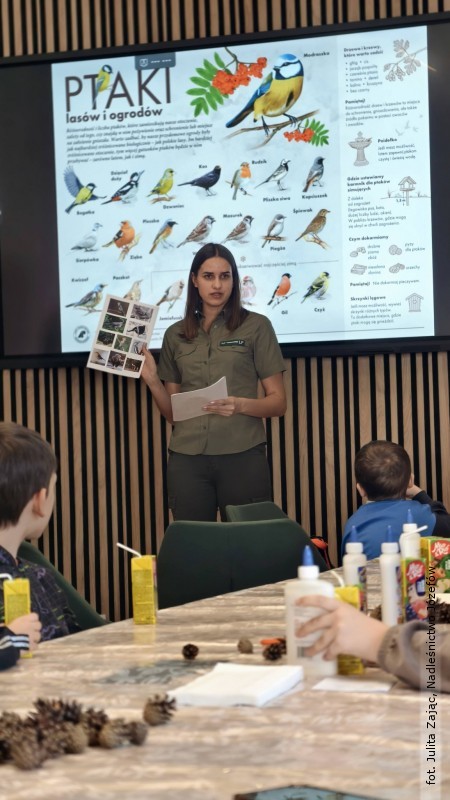 Podczas warsztatów w Nadleśnictwie Józefów rozmawiano o tym, jak zwierzyna radzi sobie w okresie zimowym. Uczestnicy dowiedzieli się również, na czym polega odpowiedzialne dokarmianie ptaków oraz uczyli się rozpoznawać różne gatunki — nie tylko te odwiedzające karmniki, ale także spotykane w lesie i jego okolicach. Spotkanie uzupełniła projekcja filmu przyrodniczego, który pozwolił przyjrzeć się ptakom z bliska.